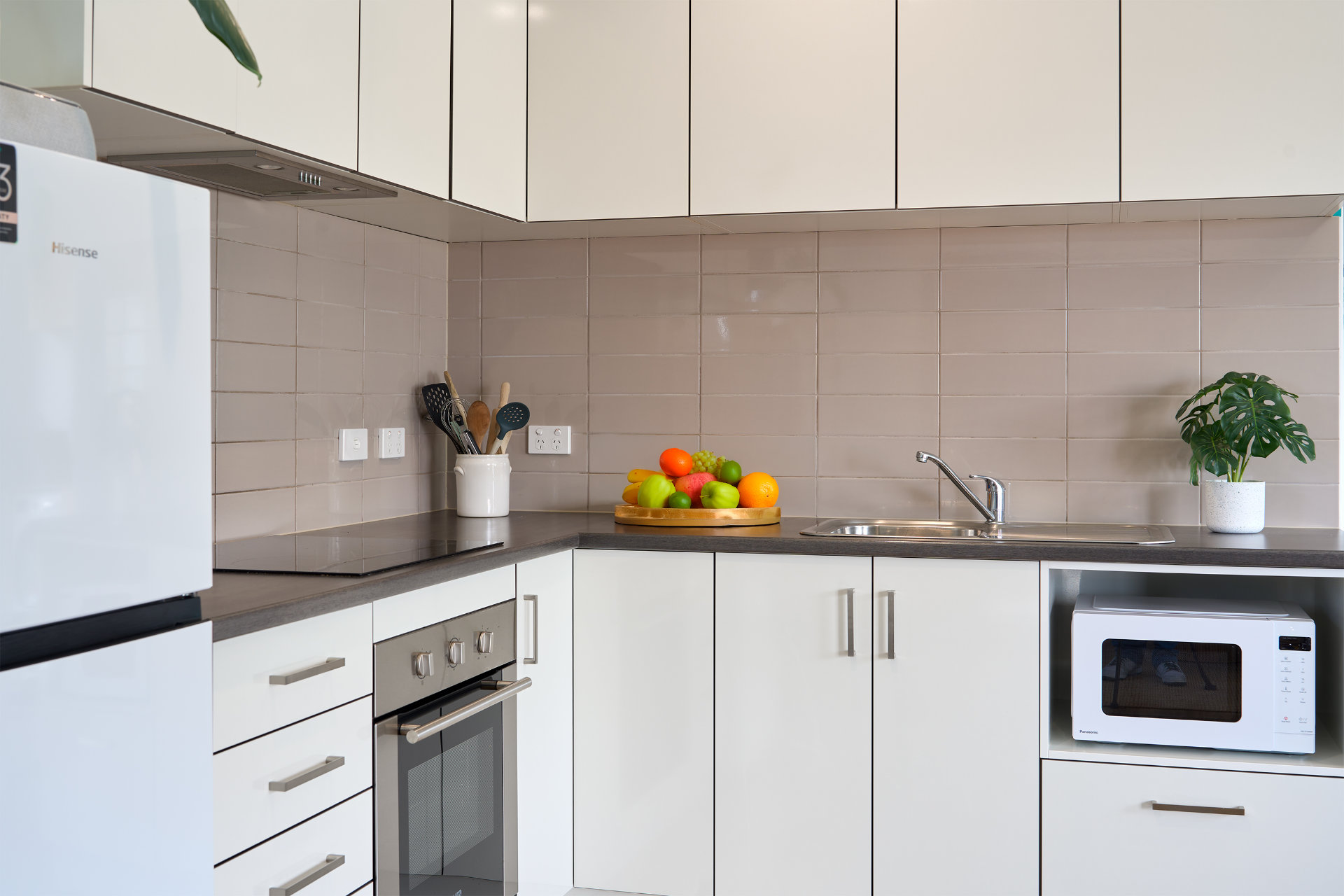 The open-plan living, dining, and self-catering kitchen area features sliding doors leading to a balcony with distant ocean views—perfect for enjoying your morning coffee at sunrise or relaxing in the evening with a BBQ.